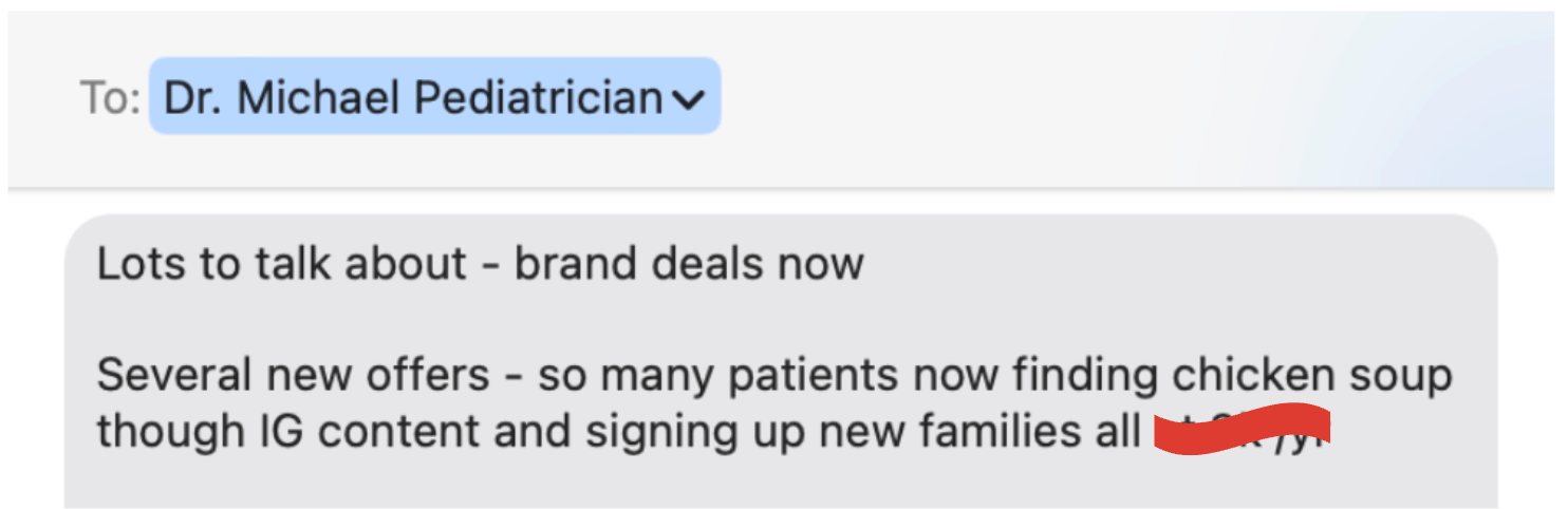 “Brand deals now. Several new offers. So many patients now finding us through IG content and signing up new families.”